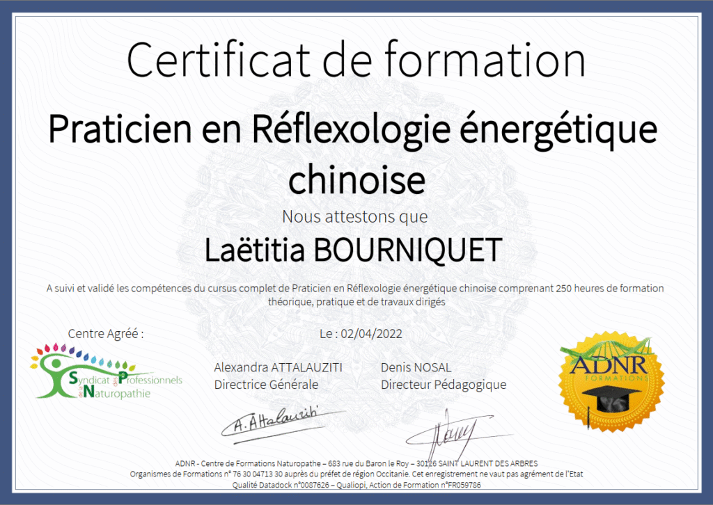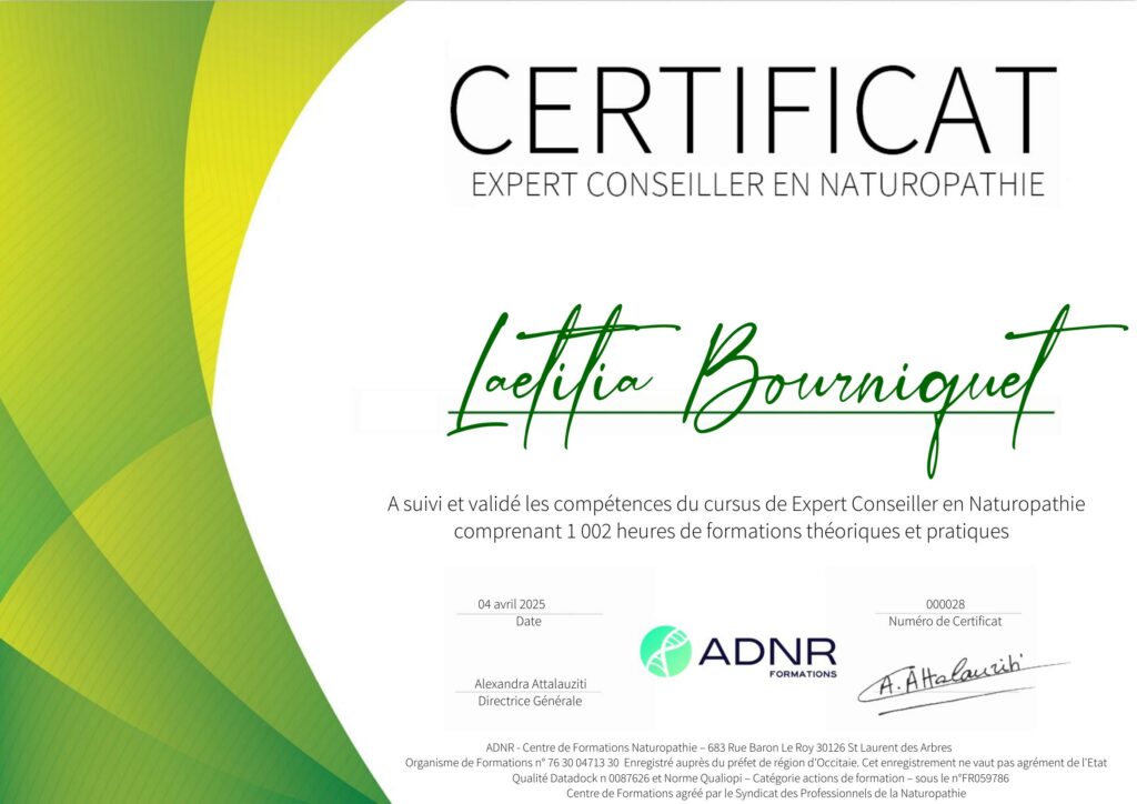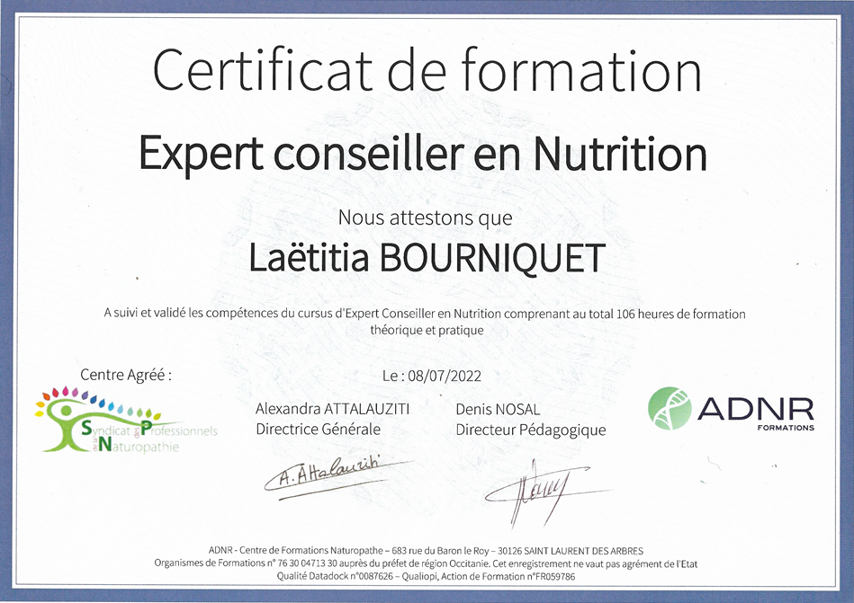 Je me suis formée auprès d’ADNR formations , organisme reconnu par le syndicat des professionnels de la naturopathie.